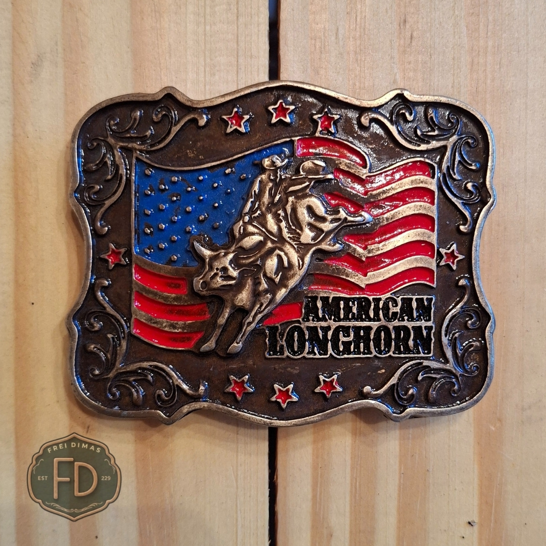 A Força do Oeste Símbolo máximo de resistência e tradição, a Fivela American Longhorn é uma peça de destaque absoluto. Com o design icônico do gado texano de chifres longos em alto-relevo, esta fivela captura a essência da vida no campo e do orgulho pecuarista. Acabamento refinado com detalhes que impressionam pelo realismo, ideal para quem busca um visual bruto e elegante.